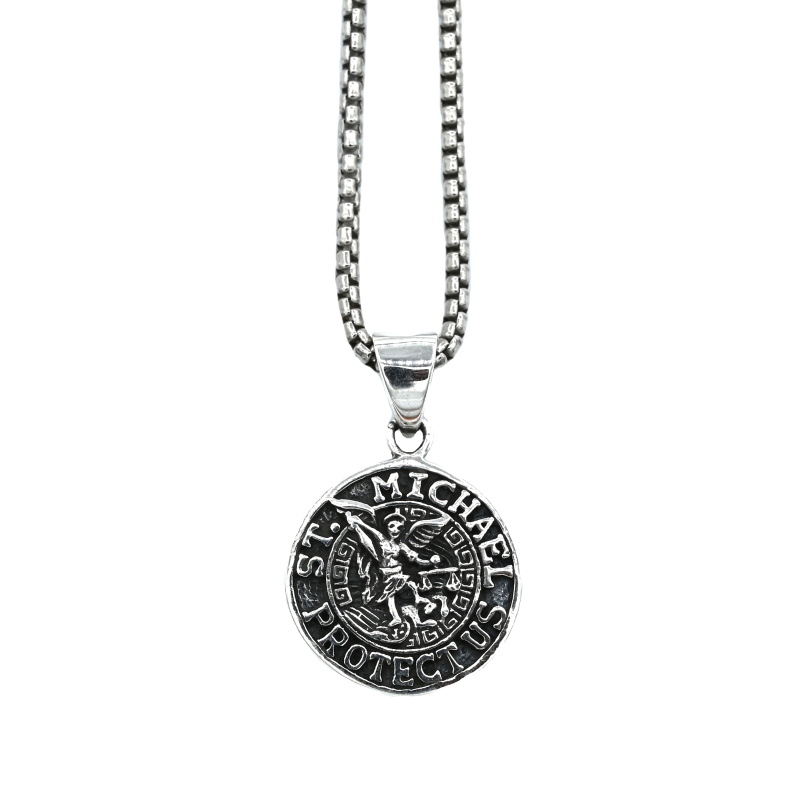 Stříbrný přívěsek malý amulet se svatým Michaelem. Nápis: ST. MICHAEL PROTECT US.