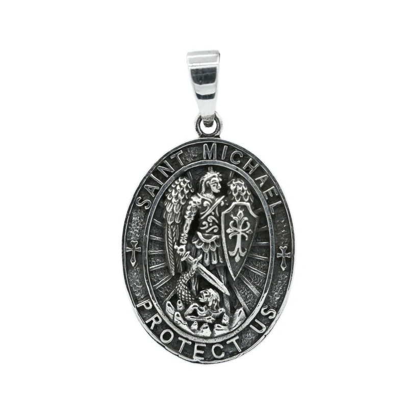 Stříbrný přívěsek amulet se svatým Michaelem. Nápis: ST. MICHAEL PROTECT US